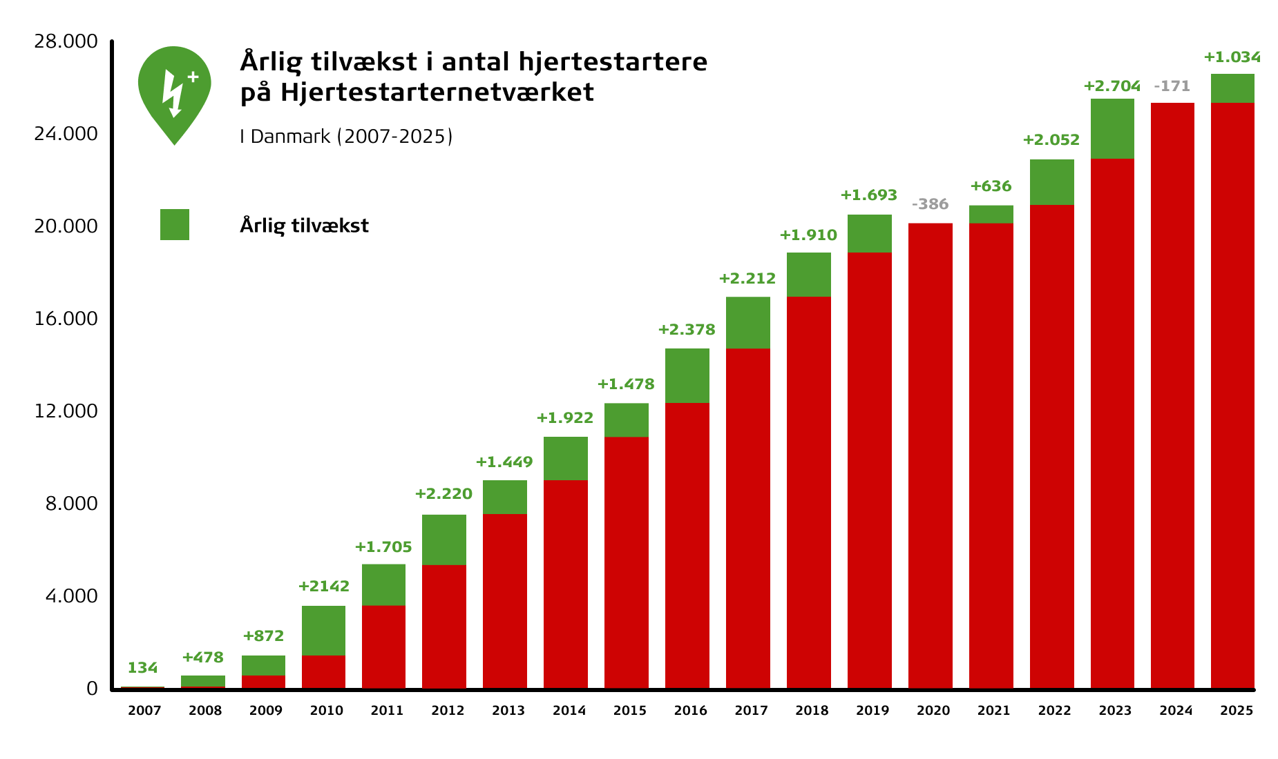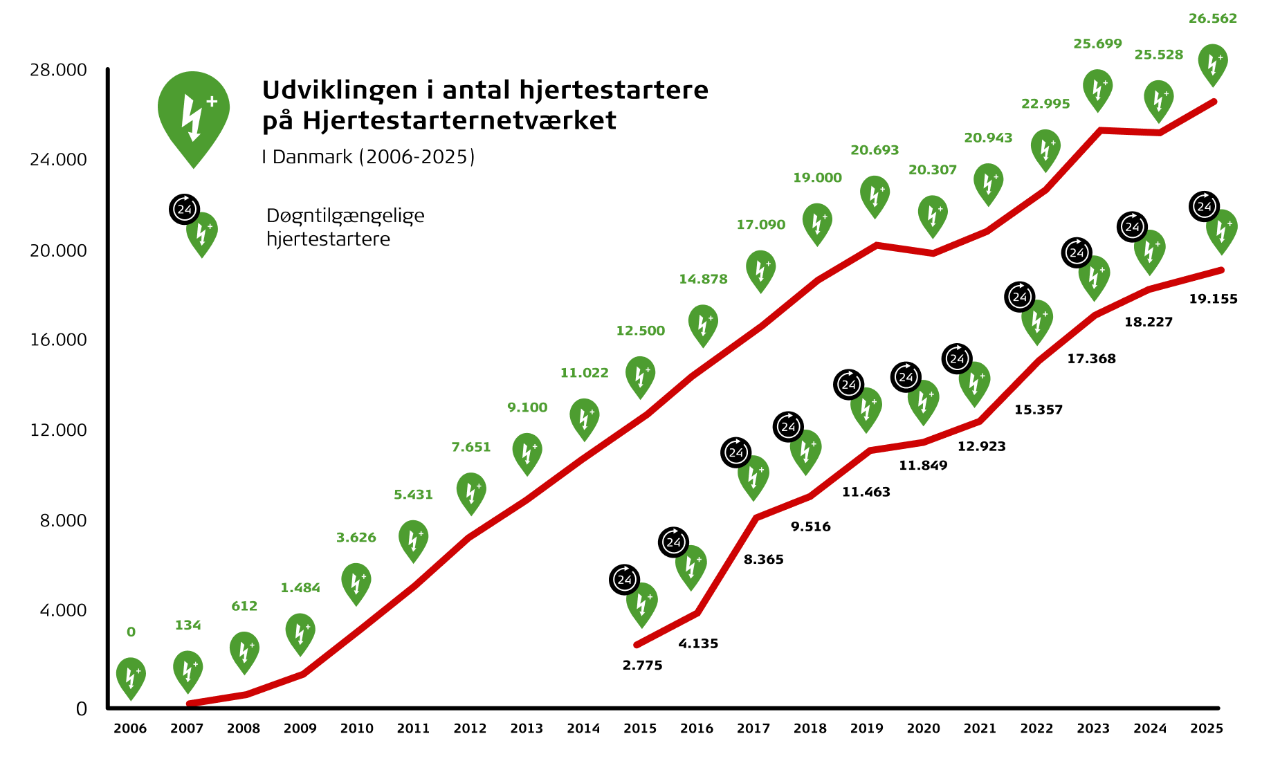 Nedenfor kan du se udviklingen i nogle af de vigtigste tal på hjertestopområdet i Danmark.