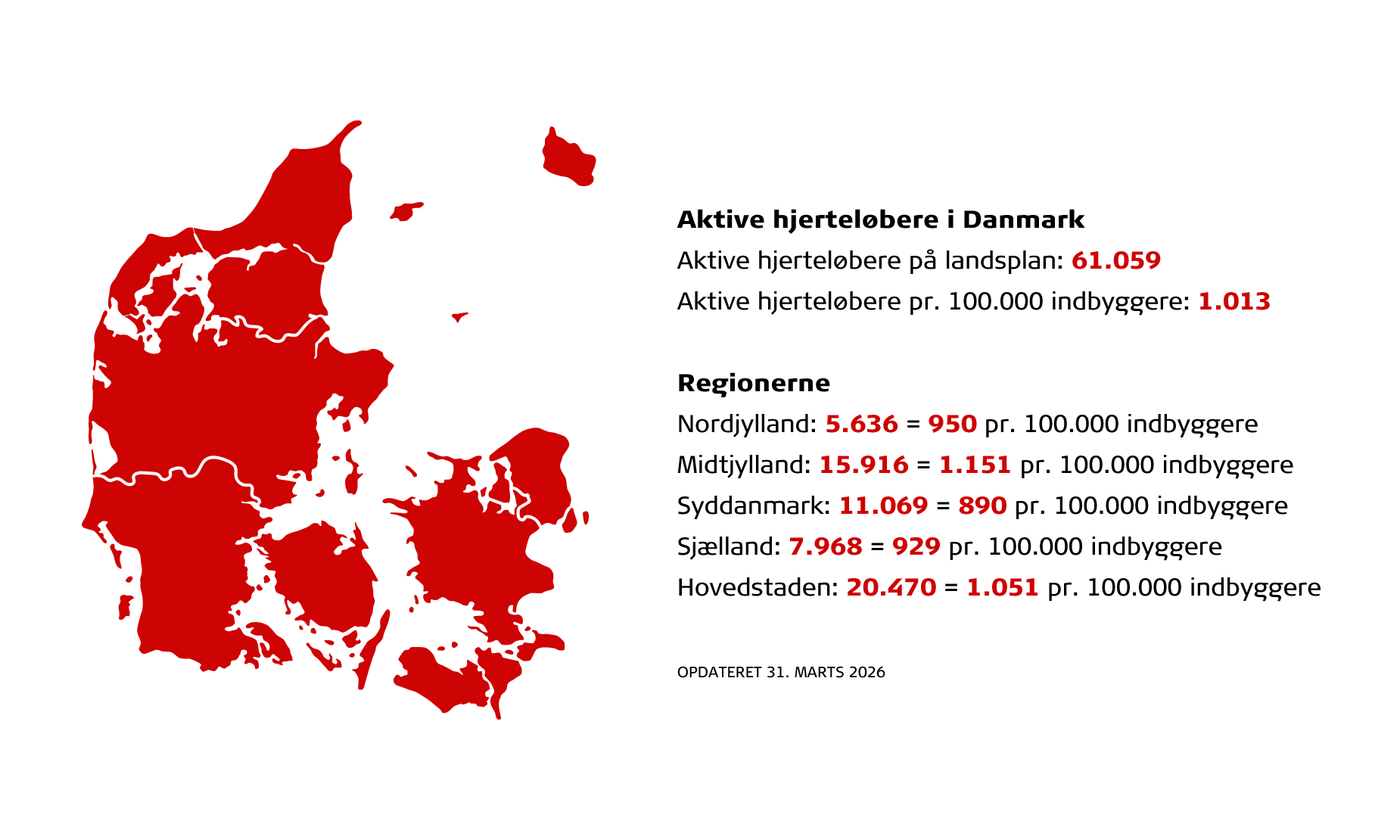 Via denne side kan du downloade den seneste statusrapport over aktive hjerteløbere på landsplan samt fordelt på regioner og kommuner. De seneste tal er fra 31. marts 2026.